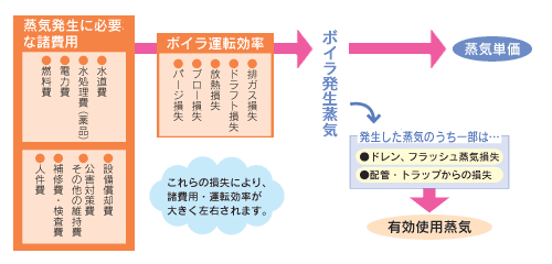 ミウラは、ボイラの日誌分析や工場診斷を通して、有効使用蒸気(生産設備に実際利用される蒸気)と諸費用(蒸気発生に必要な諸費用)との比較が、本當の意味での蒸気単価であると提案を続けてきました。